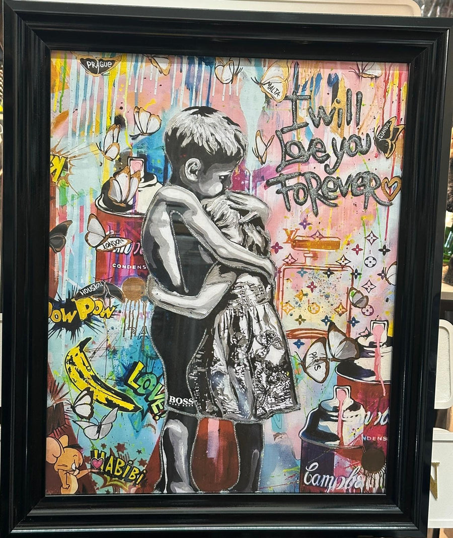 Elevate your space with this striking Black Framed Siblings Hugging Banksy Wall Art, a powerful piece inspired by iconic street art that blends emotion with modern design. Featuring a heartwarming image of siblings embracing, this artwork captures themes of love, unity, and innocence, making it a meaningful addition to any home décor.