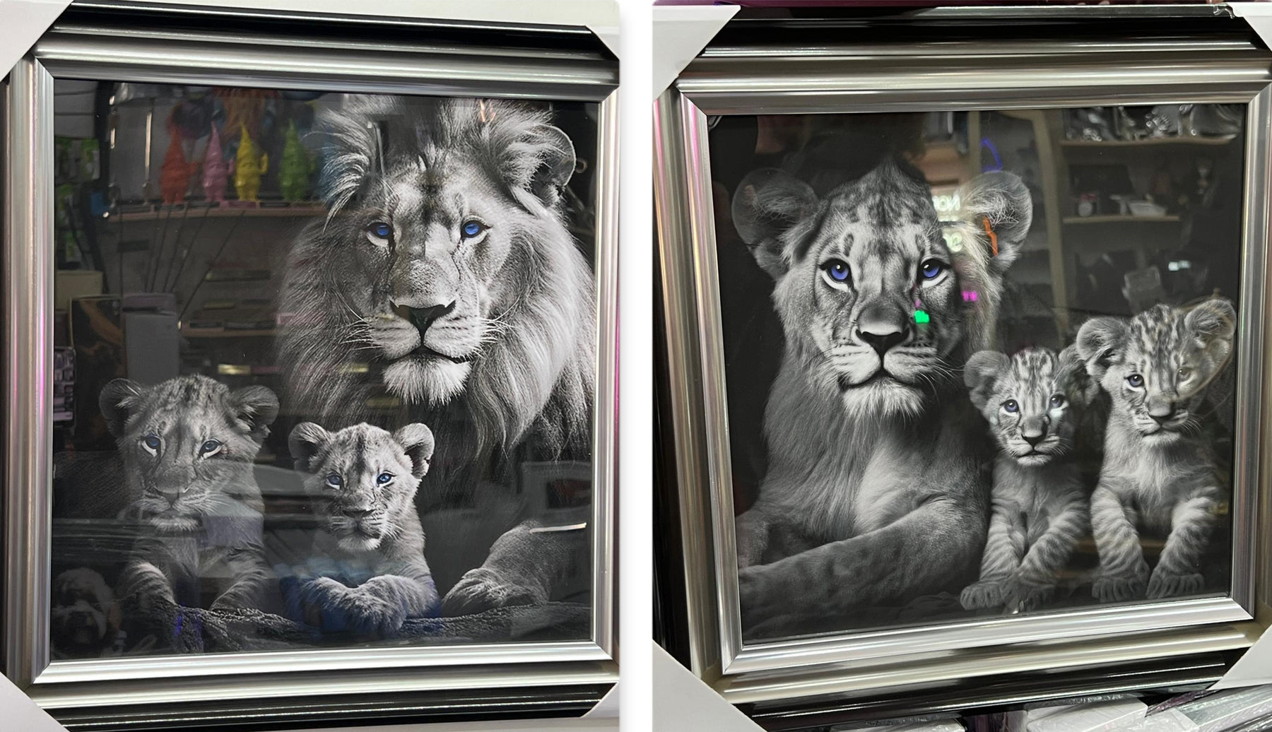 Add a touch of strength and elegance to your space with this striking wall art featuring a majestic lion with two cubs. Capturing the powerful bond between father and offspring, this piece symbolizes protection, pride, and legacy. The artwork is beautifully complemented by a stepped black and silver frame, adding depth and a modern edge. Perfect for living rooms, studies, or hallways, it serves as a bold statement piece for animal lovers and those who appreciate refined, meaningful home décor.