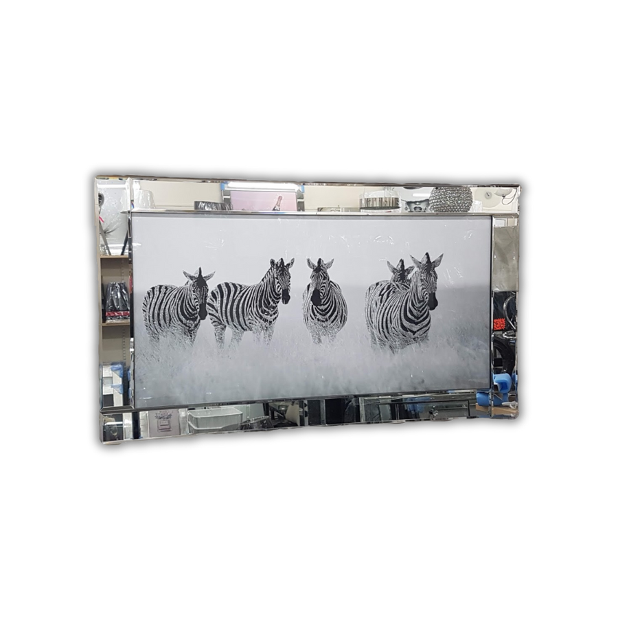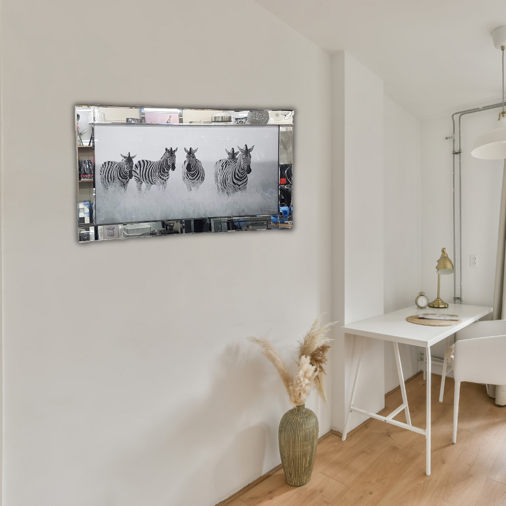 Introducing the Zebras in the Wild Mirror frame Wall Art, a stunning decorative piece that captures a herd of zebras in a beautifully detailed black and white design. This artwork is enriched with liquid art, providing a unique texture and depth that makes it an eye-catching addition to any space. The elegant mirror frame enhances the overall aesthetic, adding a touch of modern sophistication. The dynamic depiction of zebras in their natural habitat creates a striking focal point for your decor. The luxurious mirror frame adds depth and a contemporary touch to the artwork. The intricate liquid art detailing enhances the texture and visual appeal, making this piece truly unique.