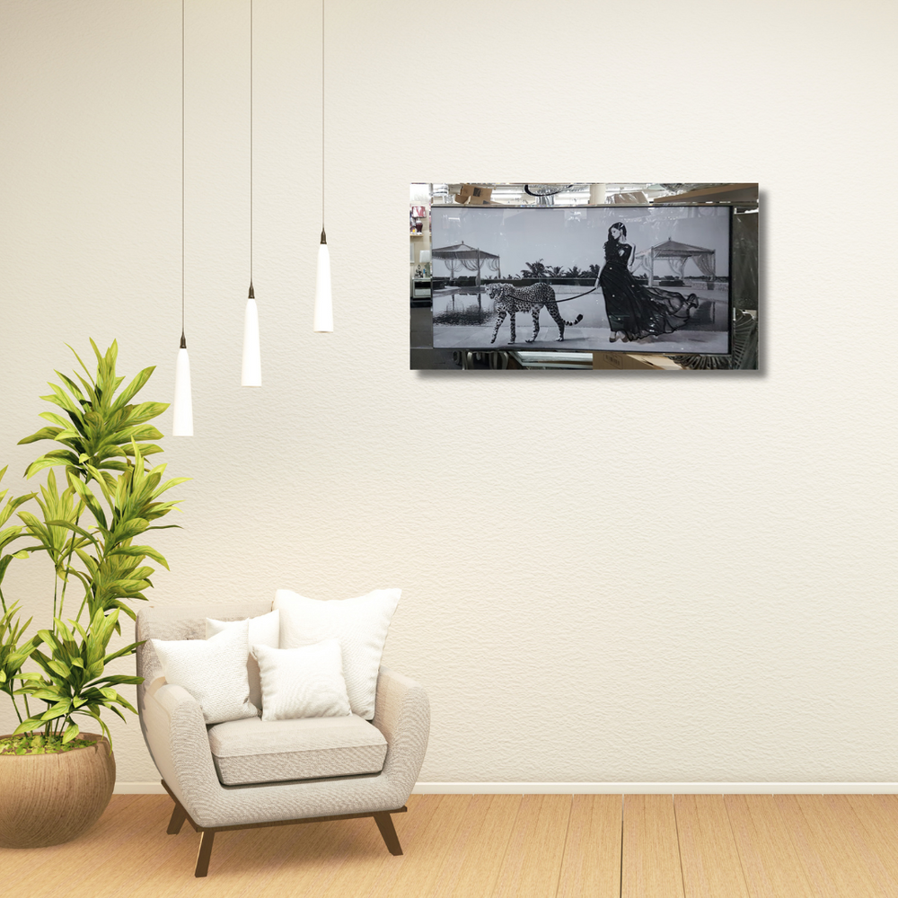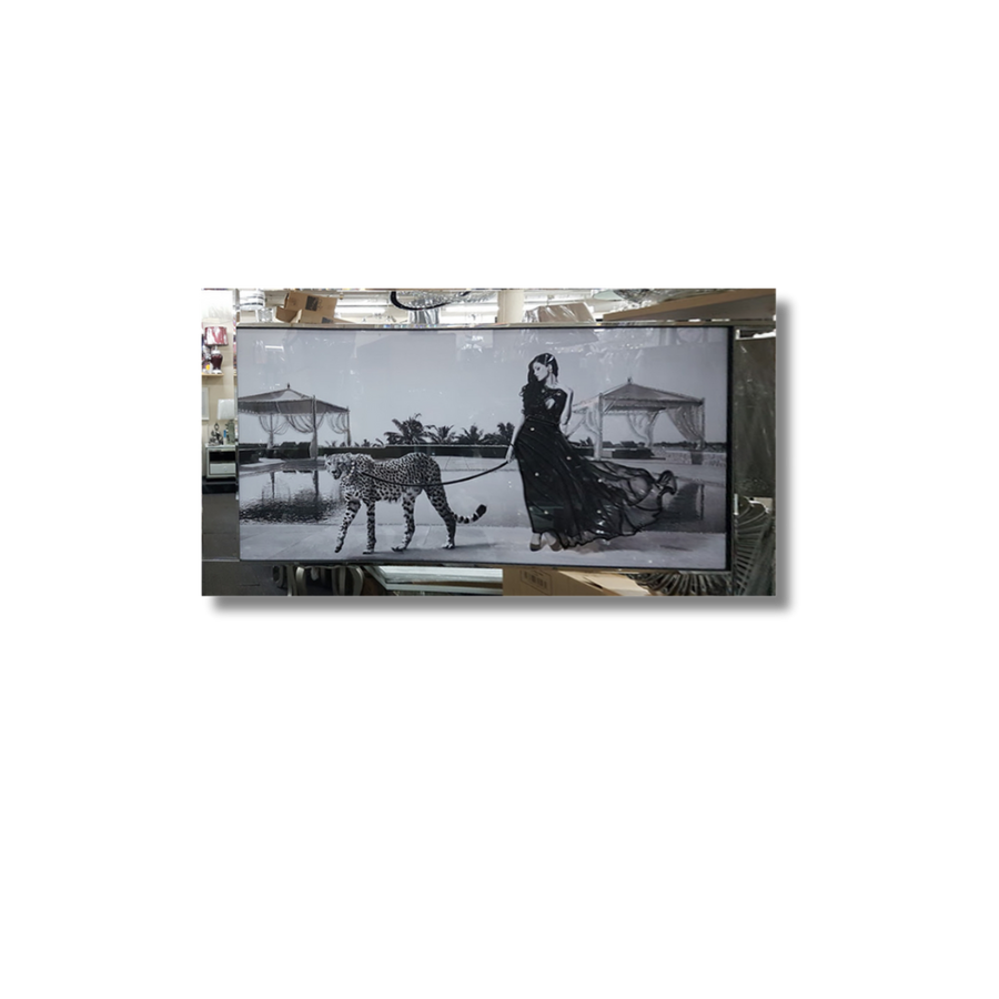 Adorn your space with the bold statement of the 'Lady in Black Dress Walking a Cheetah' decor piece, where the thrill of the wild meets the poise of high fashion. The artwork, highlighted by crystals and encased in a mirror frame, evokes a sense of daring sophistication in any room. Why you'll love it: Exotic Elegance: The rare sight of a cheetah on a leash brings an exotic touch to your decor. Fashion-Forward: A lady in a timeless black dress lends a couture feel, perfect for those with an eye for style. Sparkling Accents: Crystals add a touch of luxury, ensuring this piece catches the eye and captivates the imagination.