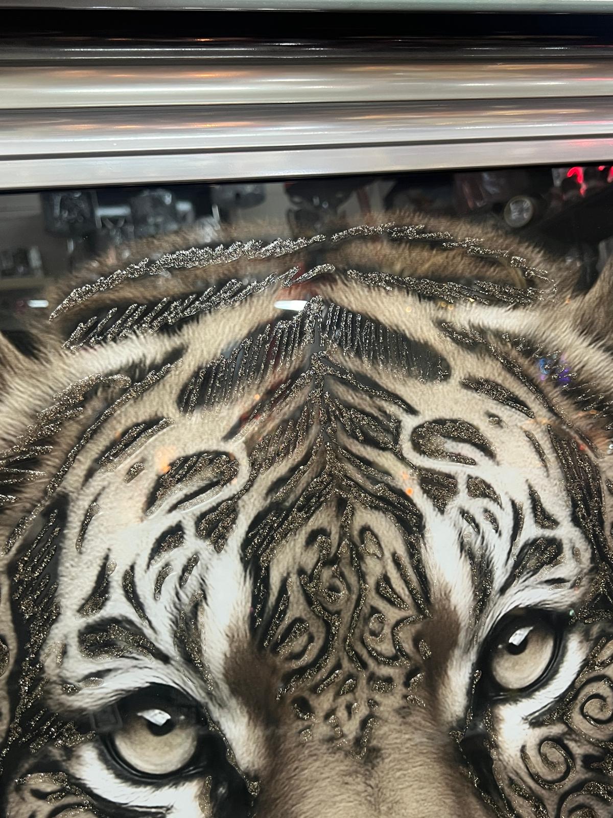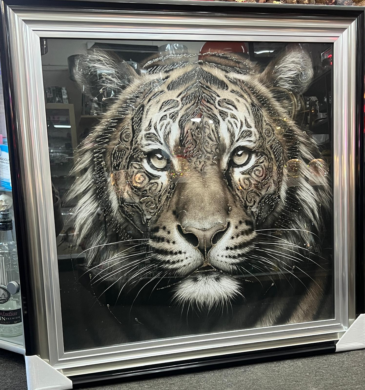 This striking wall art features bold tribal-style portraits of a tiger, blending jungle symbolism with a modern monochrome aesthetic. Presented in black and silver tones, the artwork creates a dramatic visual impact that stands out in both contemporary and traditional interiors. The detailed tribal patterns highlight the strength and presence of each animal, adding depth and character to the piece. The framed finish enhances its premium look and makes it ready to hang, offering an immediate statement feature for living rooms, bedrooms, offices, or themed spaces. This artwork provides a powerful blend of wildlife imagery and artistic design, ideal for anyone looking to elevate their décor with a distinctive and eye-catching display.