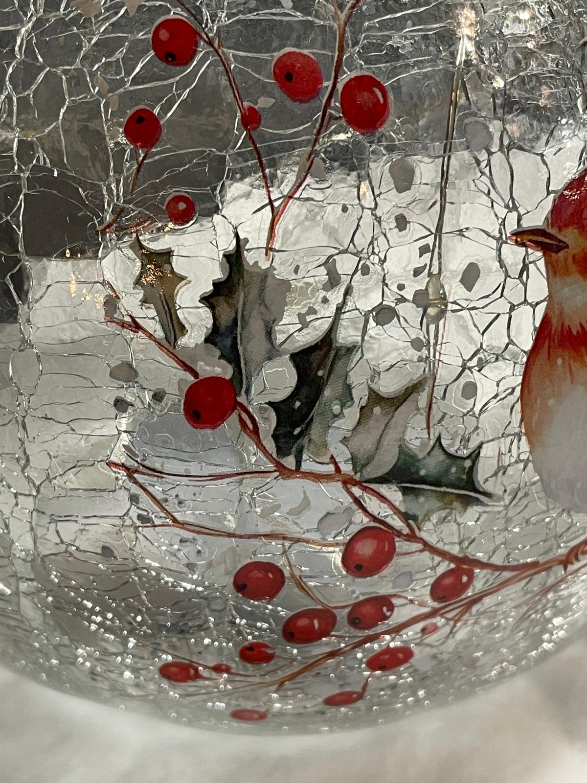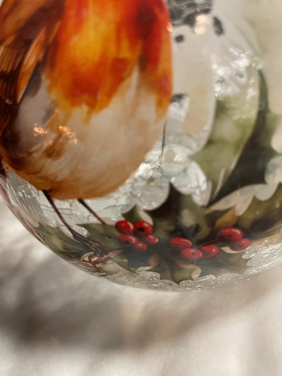 Bring festive charm to your home with this 15cm LED Lit Robin Crackle Glass Ball. Featuring a beautifully detailed robin design on crackled glass, it emits a warm, soft LED glow, perfect for cozy winter nights. Battery-operated and easy to display on mantels, shelves, or tables, it adds a touch of elegance to any Christmas décor. Ideal as a gift or seasonal accent, this delightful ornament blends classic holiday imagery with modern lighting for timeless appeal.
