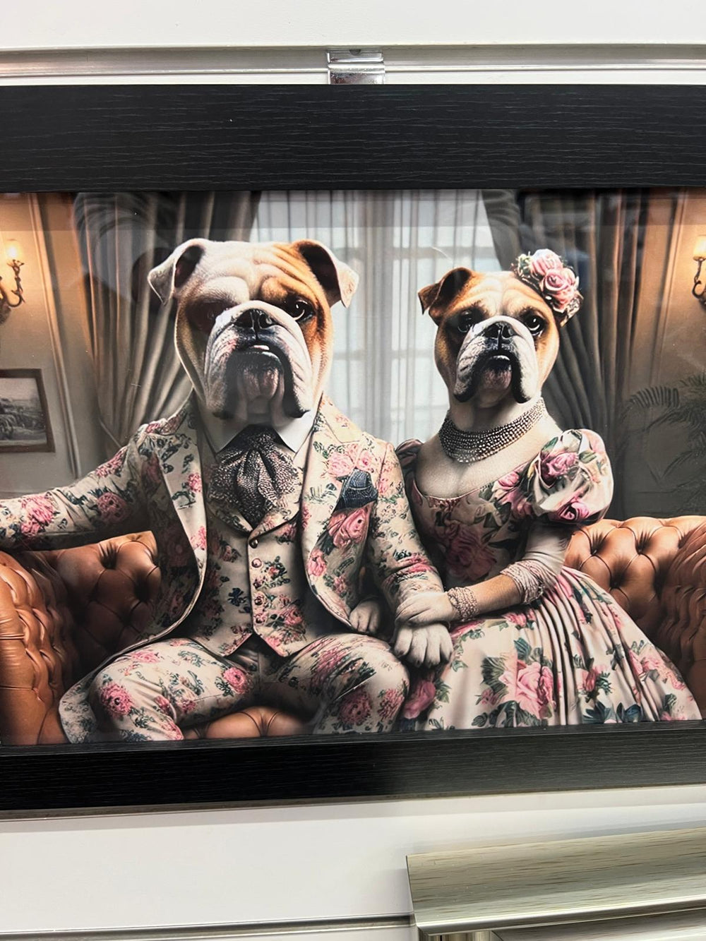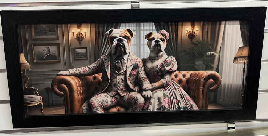 A sophisticated and charming scene featuring a bulldog couple seated gracefully on a plush, vintage-style couch. The male bulldog wears a stylish, tailored floral suit in muted tones—perhaps soft pinks, complemented by a crisp white shirt and a small bow tie. The female bulldog is equally elegant, adorned in a classic, fashionable outfit such as a lace-trimmed dress or a pearl-accented cardigan.