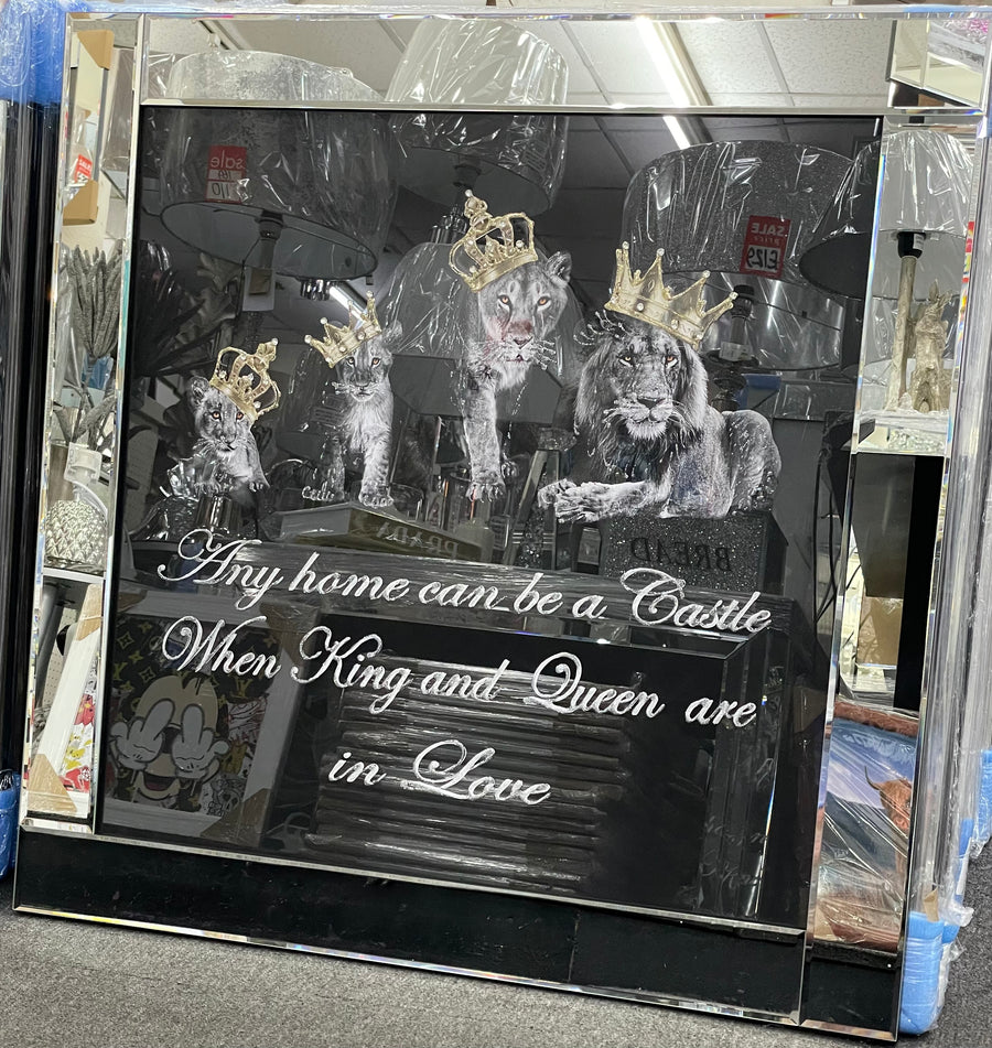 Elevate your home décor with the Royal Lion King, Queen, and Cub Wall Art with Gold Crowns and Mirror Frame. This striking piece features a majestic lion family adorned with gold crowns, accompanied by the inspiring phrase, "Any home can be a Castle when King and Queen are in Love." The luxurious mirror frame and intricate liquid art details make this artwork a statement piece for any room. Why you'll love it: Regal Imagery: The noble depiction of the lion family with gold crowns adds a touch of royalty and elegance to your space. Inspirational Message: The beautiful phrase enriches the piece with a warm, family-oriented sentiment. Mirror Frame: The sophisticated mirror frame enhances the visual appeal and adds a modern touch to your home.