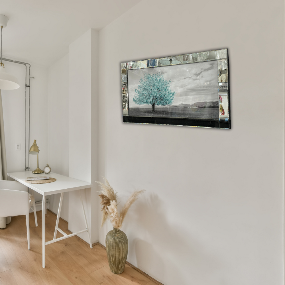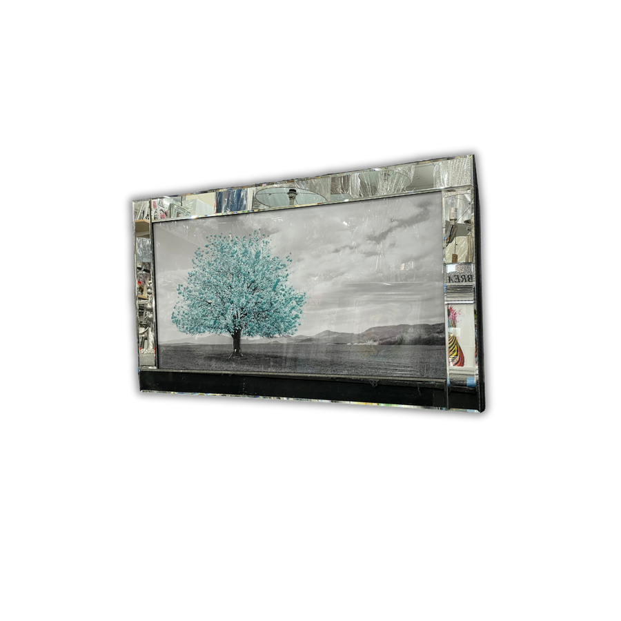 Introducing Tranquil Green Tree Blossoms, featuring a serene image of a tree with vibrant green leaves in full bloom. Enhanced with liquid art and shimmering crystals, and set in a sophisticated mirror frame, this piece brings a touch of natural elegance and tranquility to your decor. The depiction of a green blossomed tree adds a calming and refreshing element to any space. Mirror Frame: Amplifies the artwork's impact, adding depth and sophistication. Each piece is intricately detailed with liquid art and crystals, ensuring superb quality and a unique, eye-catching finish.